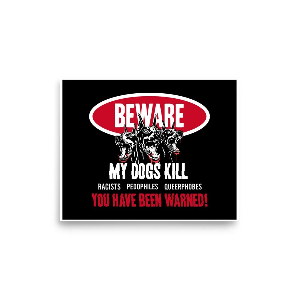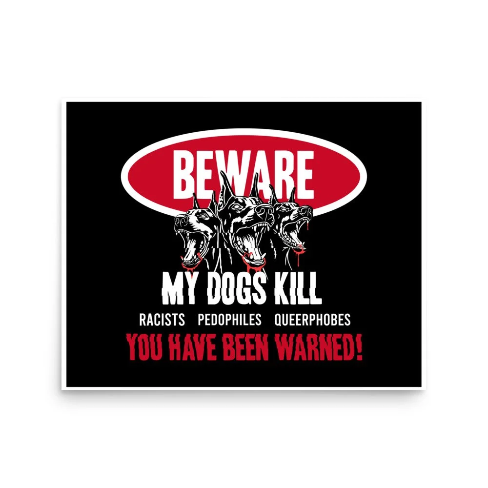 SHOP › Beware Of Dog Yard Sign Art Print Image 1 of 2 Image 2 of 2 Beware Of Dog Yard Sign Art Print from $25.99 Make Bigots Scared Again. "Beware My Dogs Kill" yard sign inspired art print comes in a museum-quality thick matte paper. • Paper thickness: 10.3 mil • Paper weight: 189 g/m² Size: Select Size 16″×20″ 8″×10″ Add To Cart Added! Make Bigots Scared Again. "Beware My Dogs Kill" yard sign inspired art print comes in a museum-quality thick matte paper. • Paper thickness: 10.3 mil • Paper weight: 189 g/m²